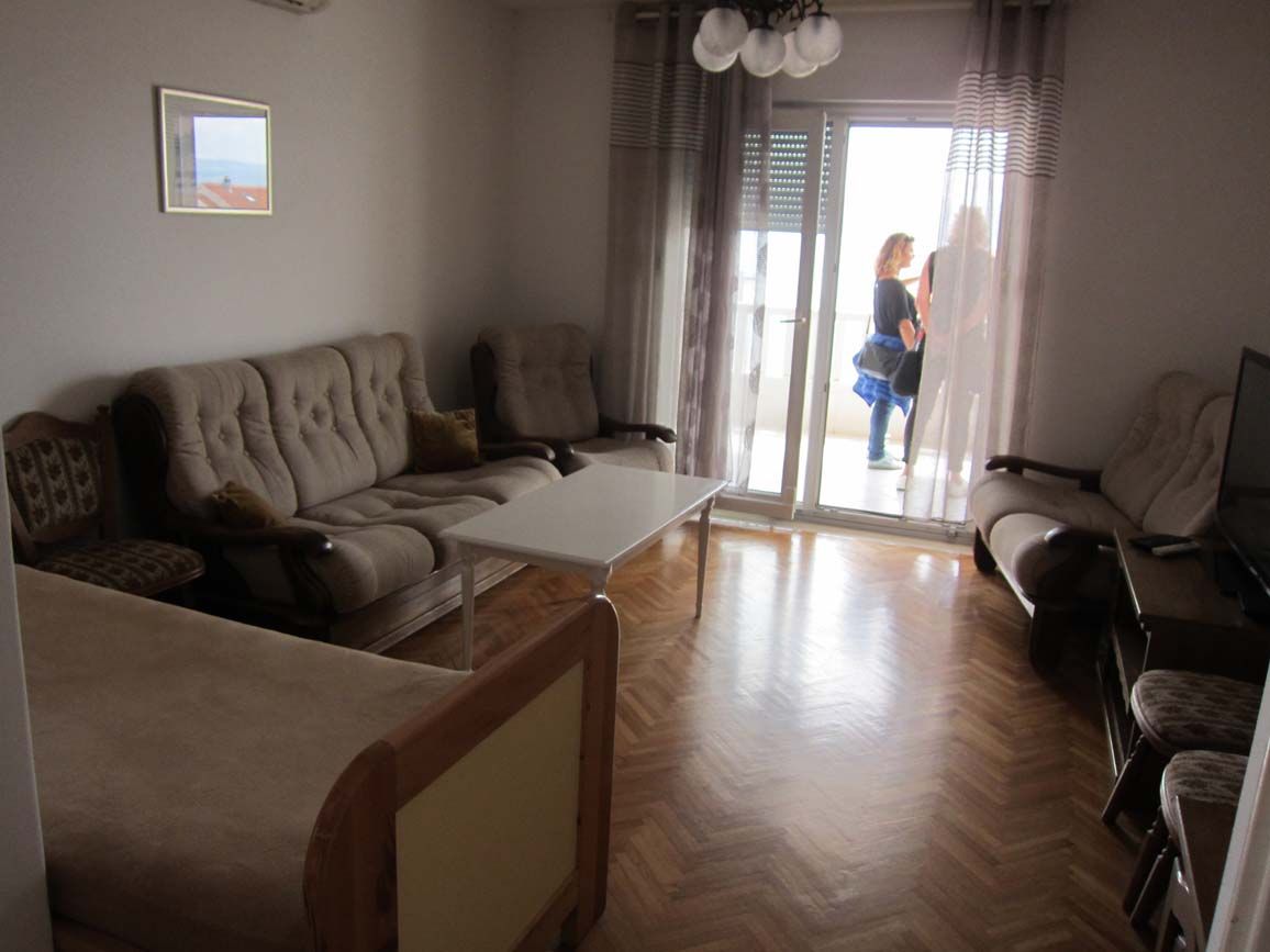 Apartment 2+2 (+1) is consisted of 1 double bedroom with own bathroom, a large living room/kitchen with 2 extra beds (extending sofa +possibility for 3rd extra bed),1 big bathroom, a large balcony with a nice sea view, AC, sat TV, parking place and a garage. Living area is 70 m2 + balcony 21 m2.